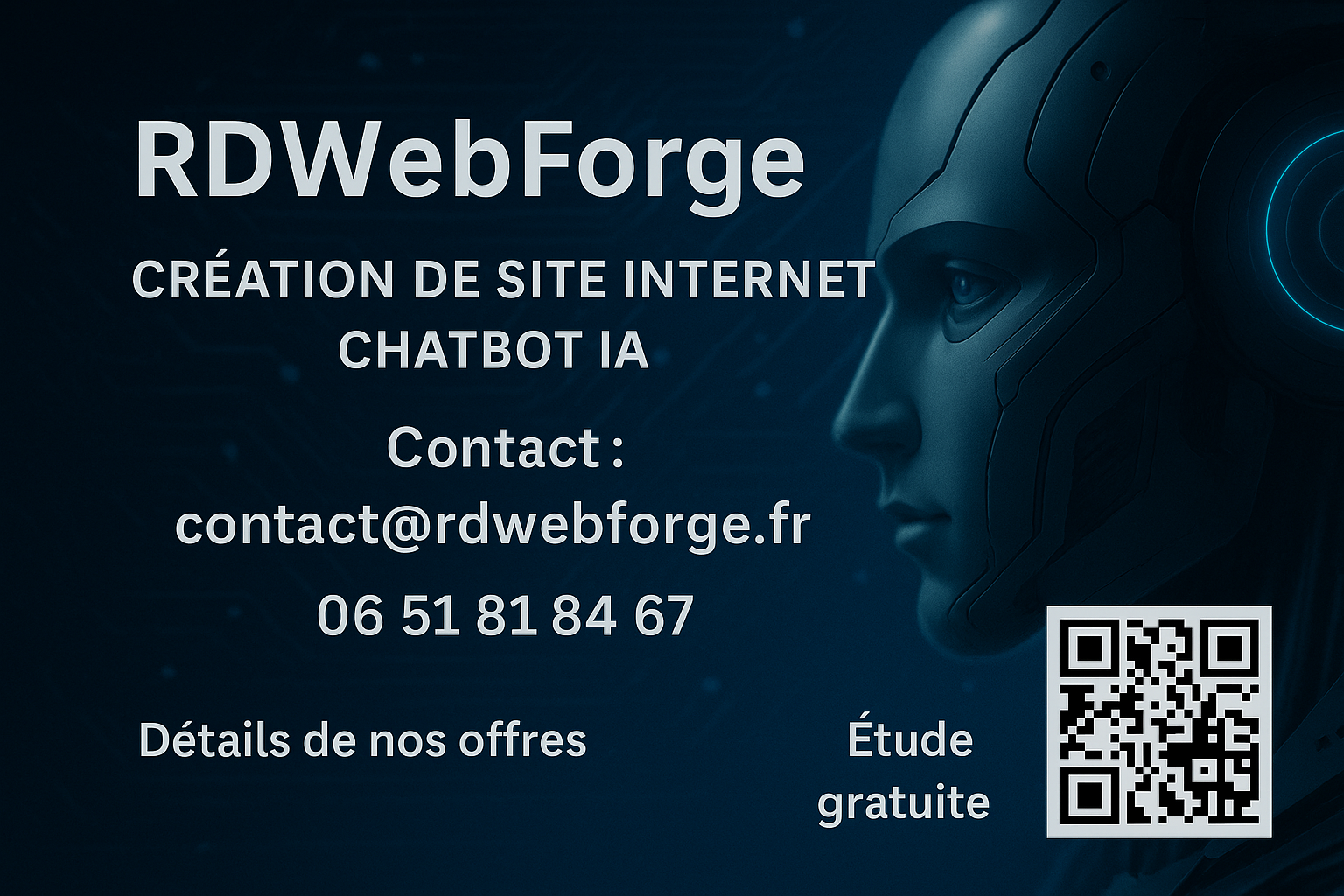 Vous avez besoin d'un site vitrine, d'une identité visuelle unique ou d'un accompagnement digital personnalisé ? RD WebForge, c'est l'efficacité d'une agence digitale, la proximité d'un artisan et la puissance de l'intelligence artificielle.